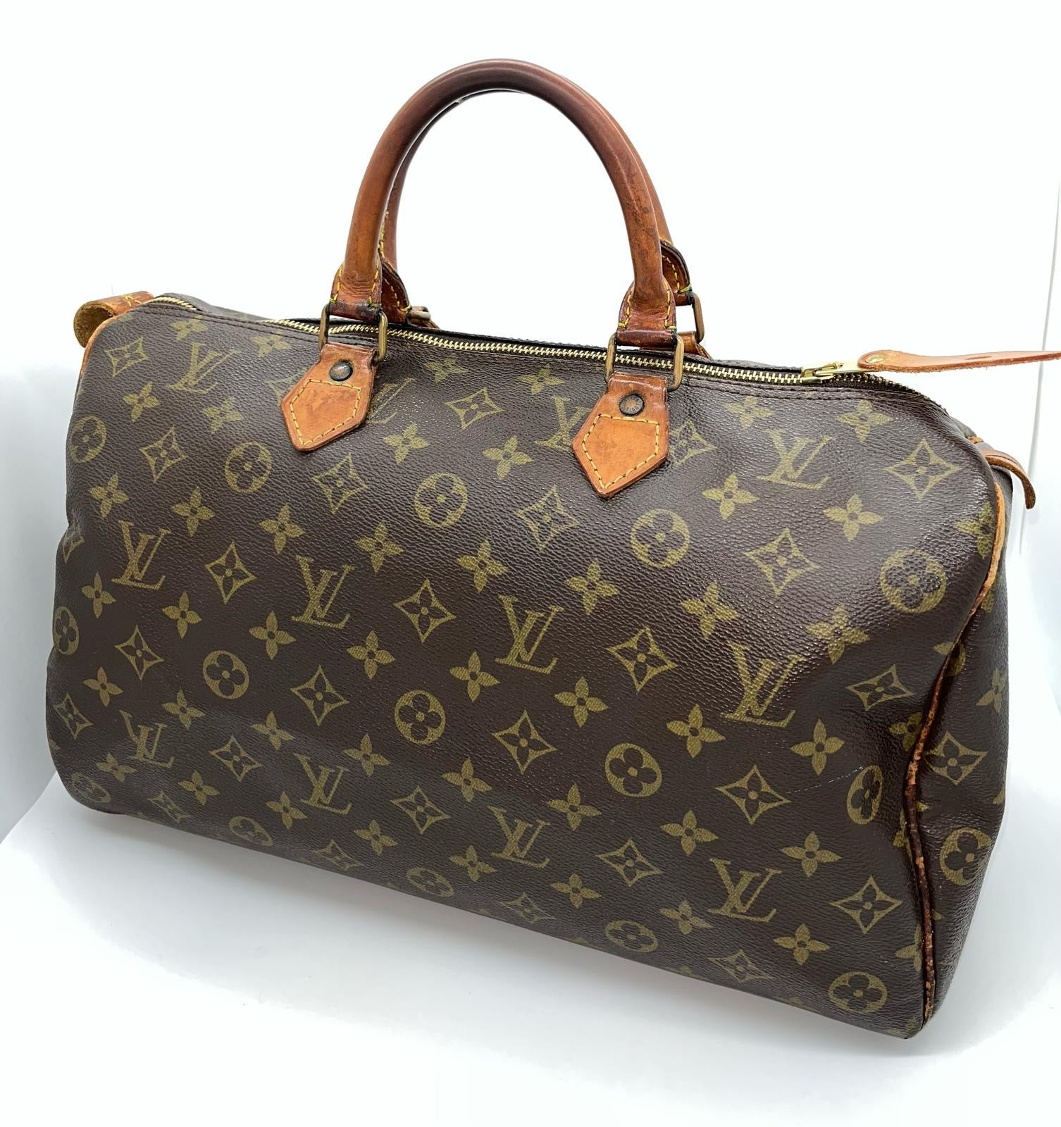 Borsa in tela Monogram, modello Speedy 35. Non presenta segni d’usura evidenti, se non un leggero consumo sugli angoli. La cerniera è in ottime condizioni. Manici e interno ben conservati.